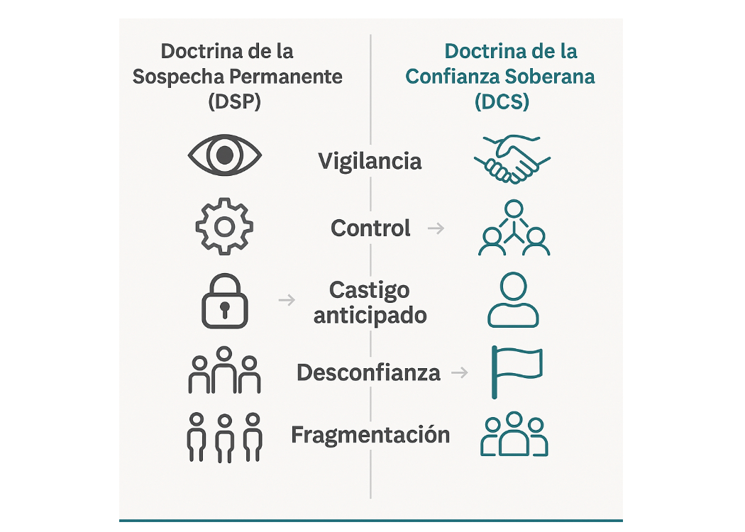 Dos arquitecturas de poder se disputan el presente y el futuro del Estado. La Doctrina de la Sospecha Permanente (DSP) organiza la vida institucional desde la vigilancia y el control, mientras que la Doctrina de la Confianza Soberana (DCS) propone reconstruir comunidad desde la dignidad y la soberanía.